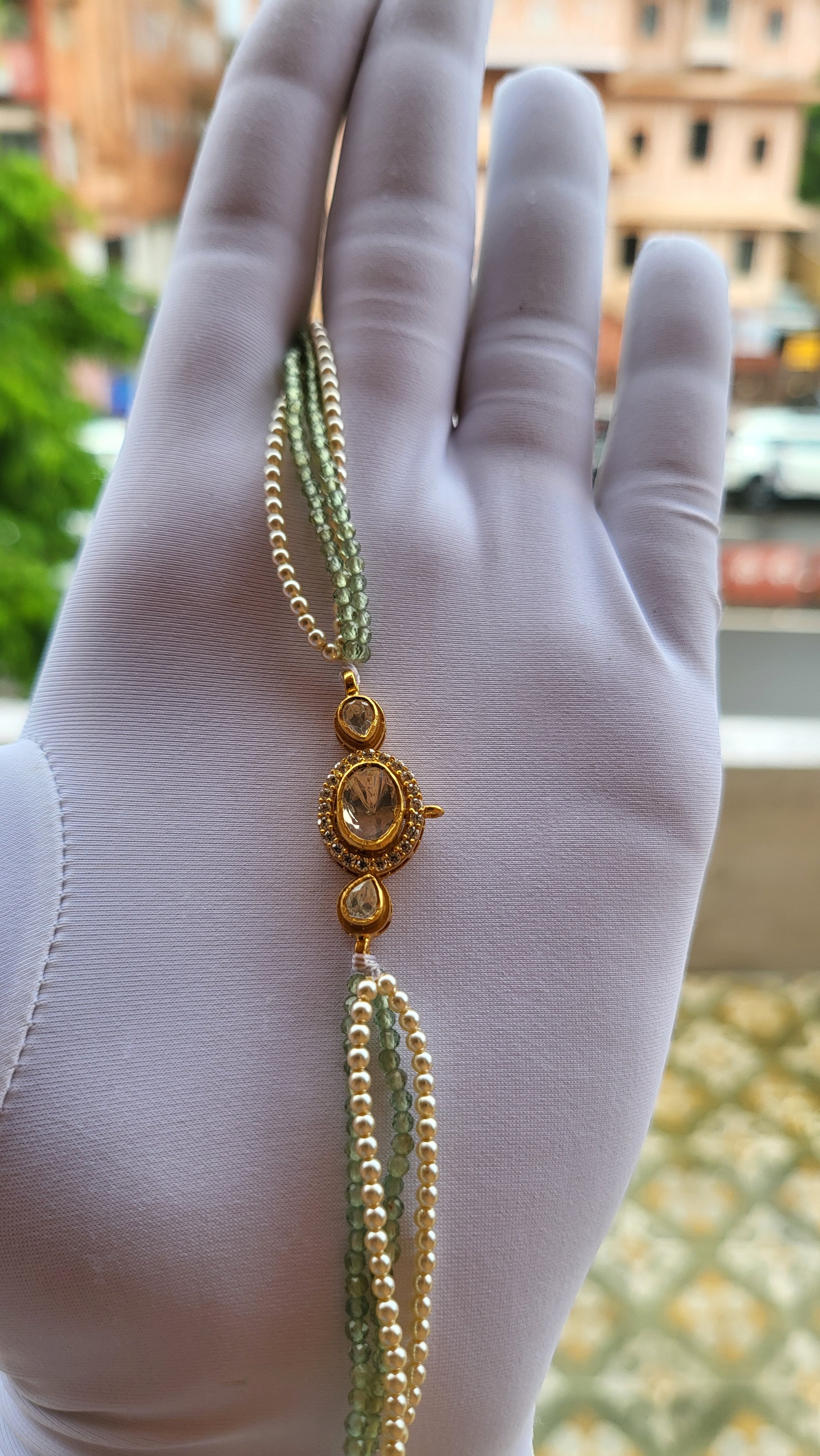 Elegant with a royal flair, the Eira bracelet showcases a vertically stacked trio of kundan-style Polki stones, centered around an oval bezel. Paired with subtle mint green beads and lustrous Swarovski pearls, this handcrafted piece exudes understated luxury—ideal for festive dressing or refined gifting.