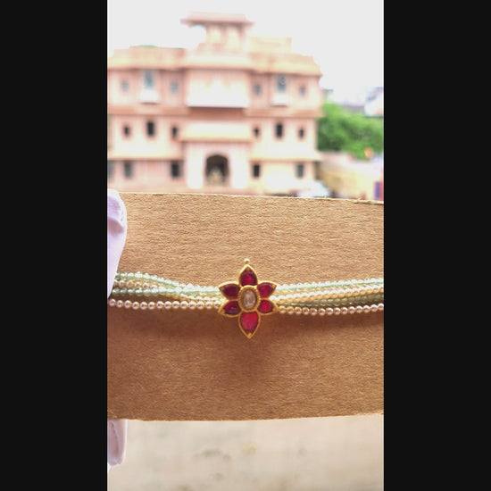Celebrate timeless elegance with this handcrafted Floral Polki Bracelet, blending intricate enamel artistry and layered strands of natural green beads and pearls. The striking five-petal floral motif, highlighted with a Polki center, radiates charm and grace—making it a beautiful gift or an accessory for any special occasion.