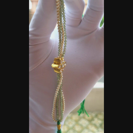 Inspired by the timeless beauty of blossoms, the Gul bracelet features a radiant ruby red enamel flower with a round Polki centerpiece, framed in a golden setting. The pastel green beads paired with lustrous pearl strands make this bracelet a graceful addition to festive and everyday wardrobes alike.