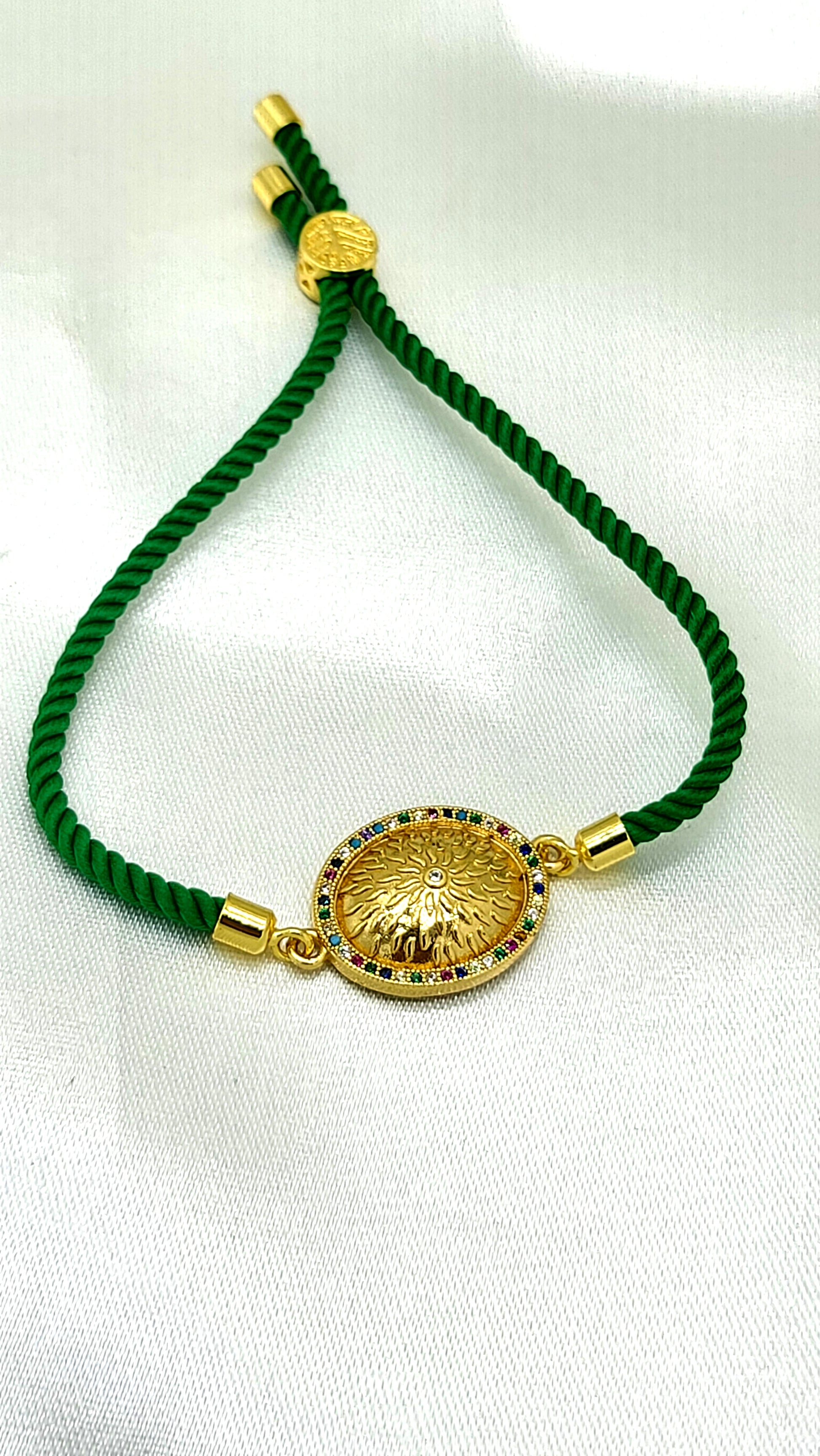 A rakhi that radiates strength and style — the Royal Emblem Rakhi features an intricately embossed oval medallion crafted in brass and adorned with a halo of multicolored stones. The bold green twisted cord gives it a premium, regal look while ensuring comfort and durability.
