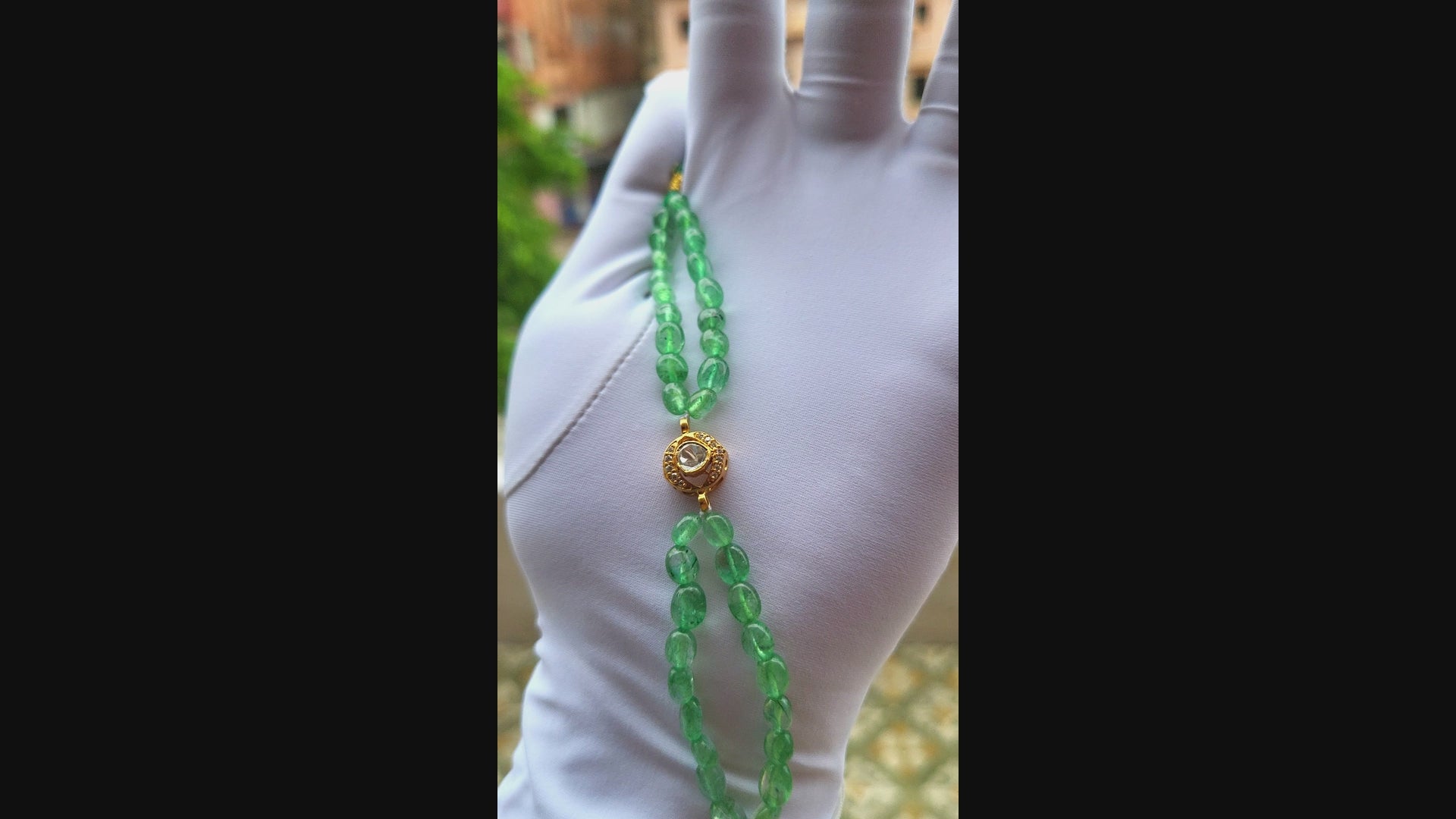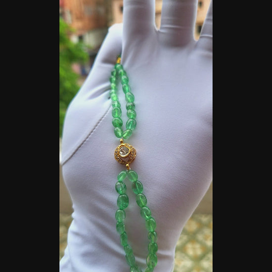 Bold and sculptural, this handcrafted bracelet highlights a teardrop-shaped Polki centerpiece in a detailed bezel setting. Strung with glossy green oval beads, it’s a statement piece that merges heritage charm with a minimal silhouette—perfect for festive or elevated everyday wear.