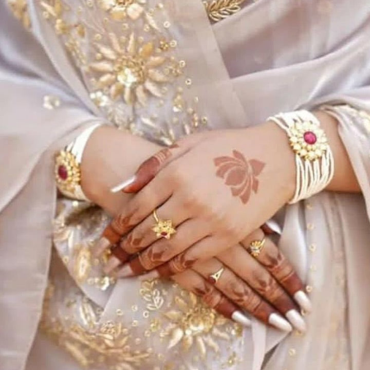 Add a touch of regal charm to your ethnic look with this stunning Traditional Kundan Pearl Hand Bracelet. This exquisite piece features a bold red center stone encircled by high-quality kundan stones, arranged in a floral motif. The bracelet is adorned with multiple strands of delicate white seed pearls, interspaced with golden beads, creating an elegant and intricate design.